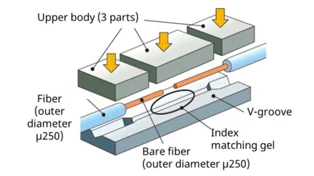 It achieves reliable connections through low loss via a precision V-groove and reduced light reflection using a refractive-index matching agent.