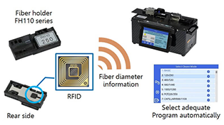 The FH110 RFID includes the holder size information. The CT115 series reads it and selects a pre-assigned program.