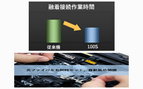 使いやすさと作業時間短縮のための多彩な機能を搭載しています。通信ケーブル用の光ファイバ融着接続機では様々な自動機構や光ファイバセット時のクランプ連動機構などにより、作業効率の向上をサポートします。
