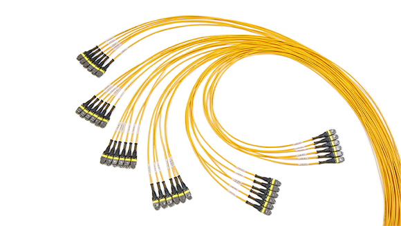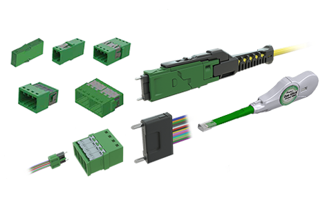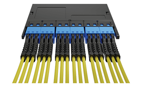 12心MPO(12MPO)コネクタを用いたケーブリングシステムは、すべての製品が光コネクタ付けされているため、製品同士を光コネクタでつなぐだけで光ケーブリングシステムを構築できます。これにより短時間で施工することができます。また12MPOコネクタを用いることで配線ボリュームを大幅に減らすことができます。万が一ケーブルが損傷しても、融着型現場組立光コネクタを用いれば素早い復旧が可能です。