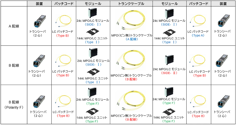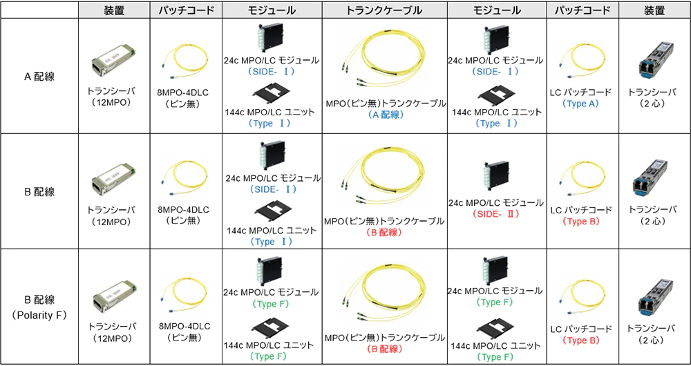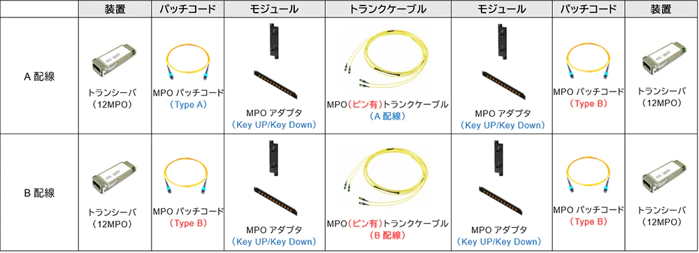 | 構成部材 | トランクケーブル | A配線(MPO ピン無) | B配線(MPO ピン無) | B配線(MPO ピン無) |