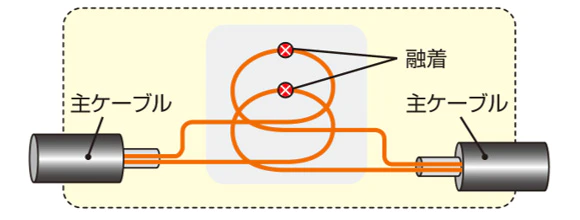 ケーブルのスロットのみを切断し、光ファイバ心線は切断せずに通過心線収納トレイに収納し、必要な心数のみを分岐ケーブルと接続します。