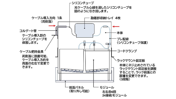 - データセンタ内における光ケーブル成端を伴う高密度配線、 DCIにおける外線ケーブルの引き込み先が19インチラックの場合、成端ユニットとして使用可能