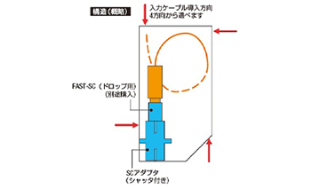 ドロップ/インドアケーブルの端末に現地で光コネクタ取付け加工後に直接取付けられるため、心線の収容が不要で安心設計になっています。
