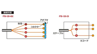 - 入力は多心光ファイバケーブル、光成端箱内のアダプタを介してコネクタ接続後、単心光ファイバケーブルを出力