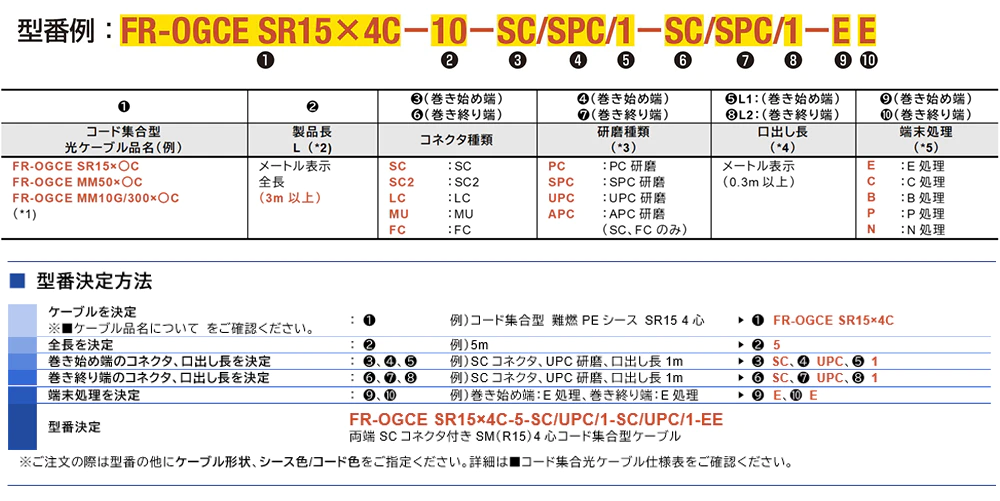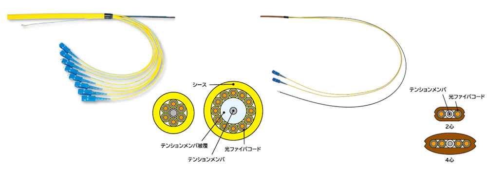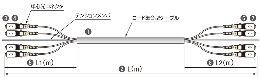 SCコネクタ、LCコネクタ、MUコネクタ、FCコネクタを両端に取り付けたコード集合型ケーブルです。