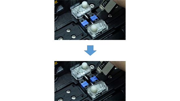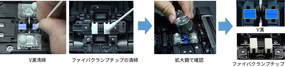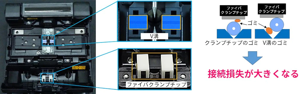 V溝やファイバクランプチップのゴミがファイバに付着して、融着接続動作に影響を与え、接続損失が大きくなる可能性があるため、定期的にV溝とファイバクランプチップを清掃することをお勧めします。