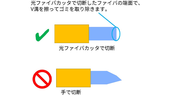 2. 綿棒でV溝のゴミを取除くのが難しい場合、接続同様に光ファイバカッタで切断した光ファイバの端面で、V溝を擦ってゴミを取除きます。