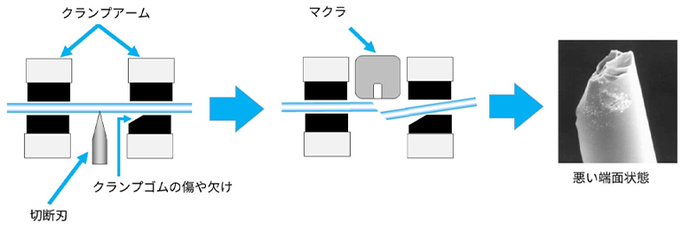 その状態で切断を行うと光ファイバに傷をうまくつけられず、良好な端面が得られなくなります。