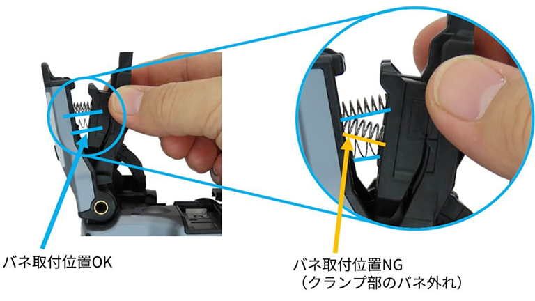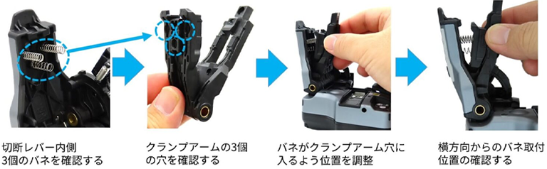 ※クランプアームをセットする際、切断レバーのバネが穴から外れないよう注意してください。