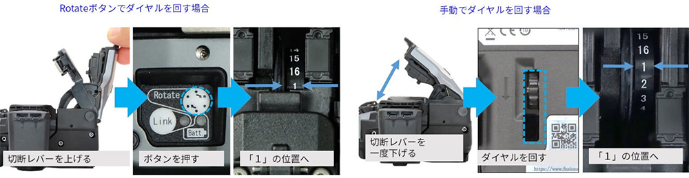 Rotateボタン、又は本体裏側の刃回転ダイヤルを使用し「1」にしてください。