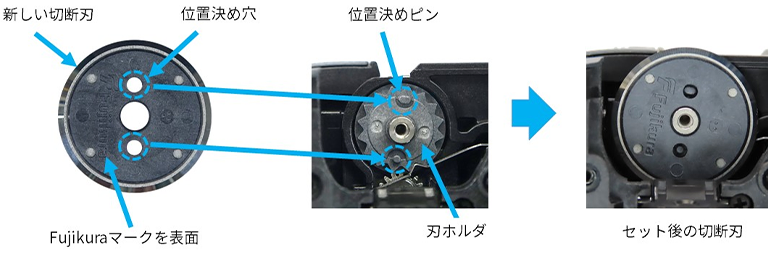 9. 新しい切断刃を刃ホルダの位置決めピンにセットします。