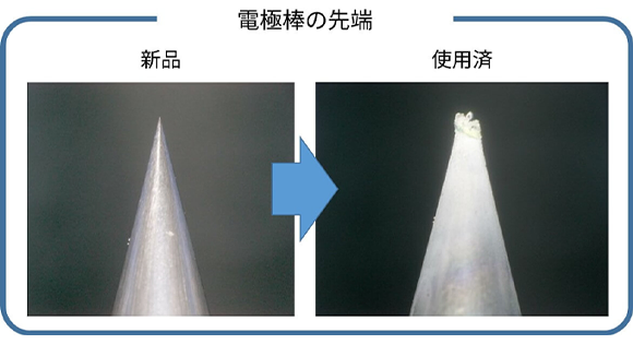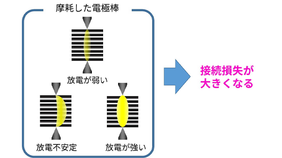電極棒が摩耗すると放電状態が悪くなり接続損失が大きくなるため、電極棒の交換をお勧めします。