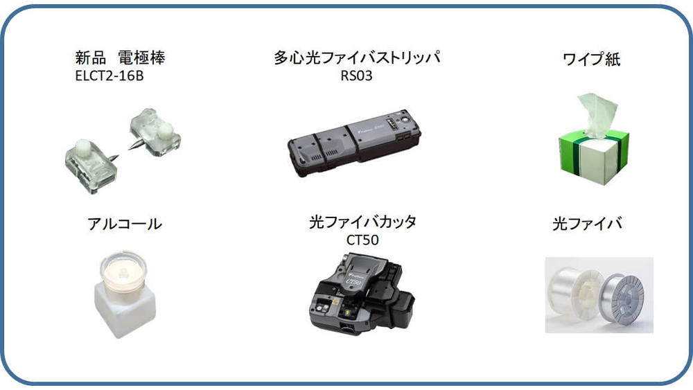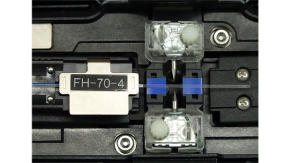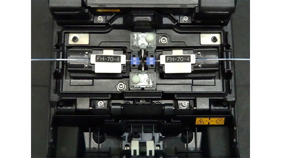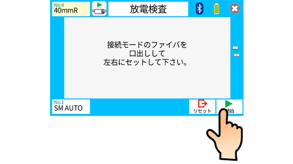 8. 放電電極棒の安定化後、放電検査を実施します。光ファイバ融着接続機に被覆除去してアルコール清掃を行い、光ファイバカッタでカットした光ファイバを左右にセットします。モニタ右下の開始アイコンを押します。
