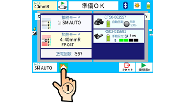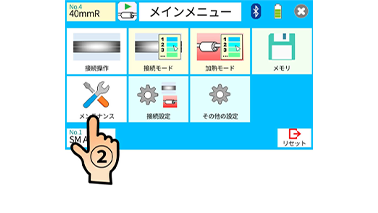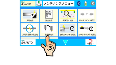 2. モニタの準備完了状態のメニュー画面を押します。次に画面のメンテナンスアイコンを押します。次にメンテナンスメニューの電極棒交換アイコンを押します。