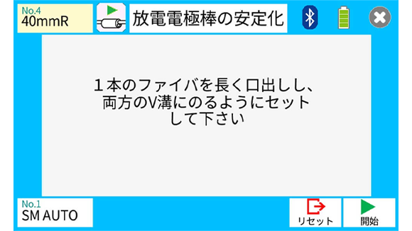 7. 放電電極棒の安定化を行います。光ファイバ融着接続機に被覆除去してアルコール清掃を行い、光ファイバカッタでカットした光ファイバを左右にセットします。モニタ右下の開始アイコンを押します。