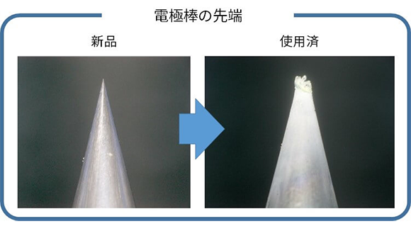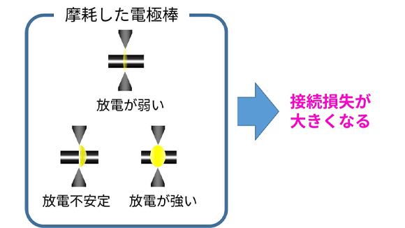 電極棒が摩耗すると放電状態が悪くなり接続損失が大きくなるため、電極棒の交換をお勧めします。