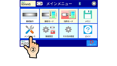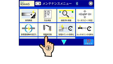 2. モニタの準備完了状態のメニュー画面を押します。次に画面のメンテナンスアイコンを押します。次にメンテナンスメニューの電極棒交換アイコンを押します。