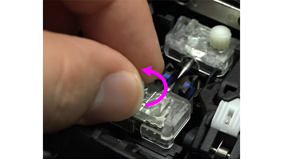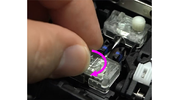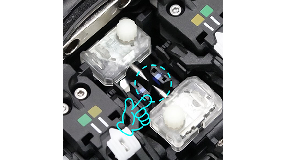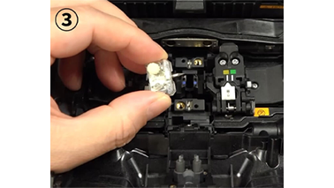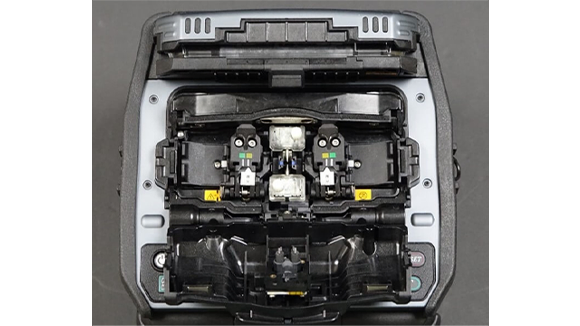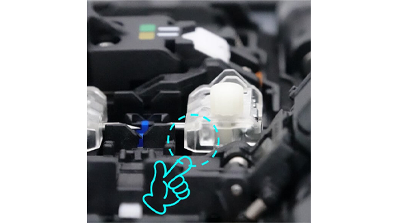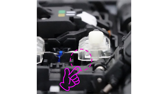 4. 風防を手で開きます。そして電極棒固定ネジを指で緩めます。光ファイバ融着接続機から両方の電極棒を取り外します。