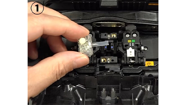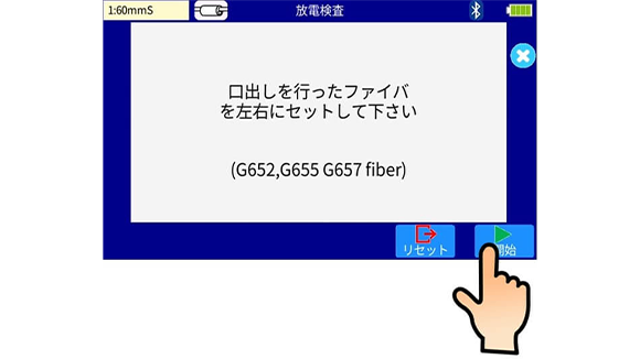 9. 放電電極棒の安定化後、放電検査を実施します。光ファイバ融着接続機に被覆除去してアルコール清掃を行い、光ファイバカッタでカットした光ファイバを左右にセットします。モニタ右下の開始アイコンを押します。
