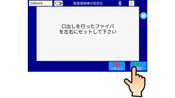 8. 放電電極棒の安定化を行います。光ファイバ融着接続機に被覆除去してアルコール清掃を行い、光ファイバカッタでカットした光ファイバを左右にセットします。モニタ右下の開始アイコンを押します。