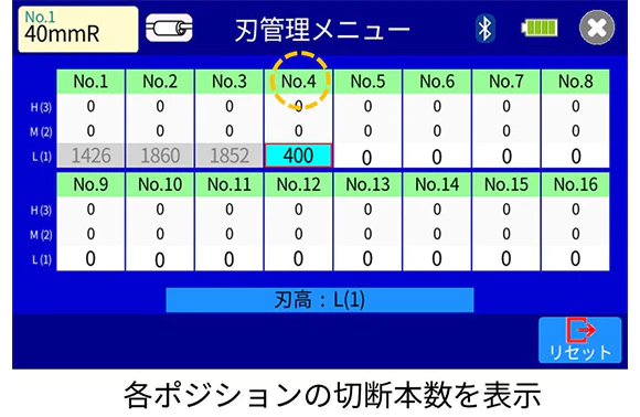 ⇒ファイバ切断による作業の失敗を最小限に! - 全ての切断刃ポジションの使用状態を一目で確認可能。