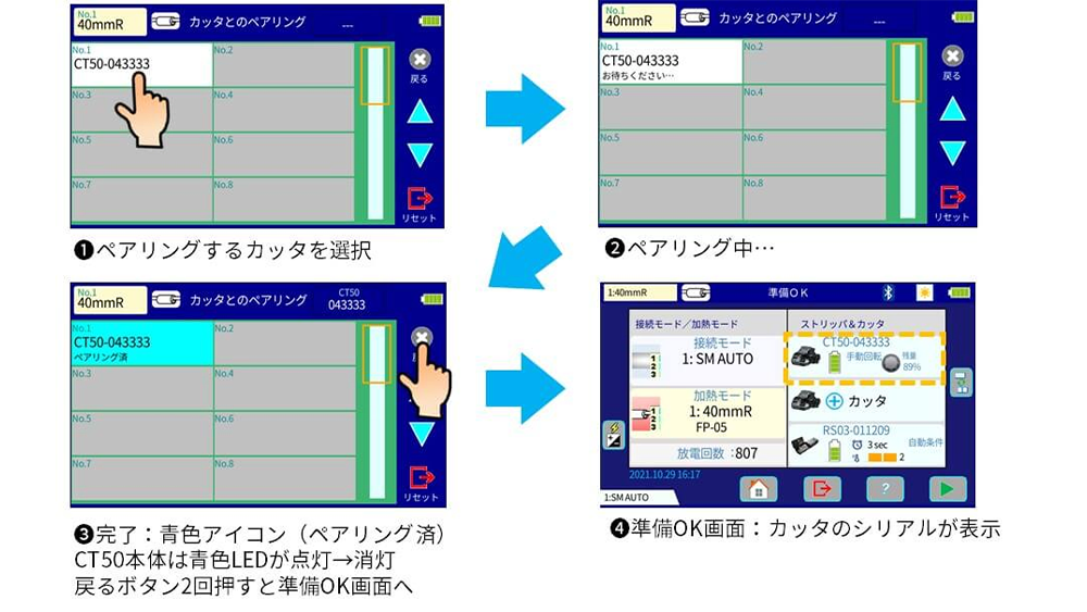 3. 光ファイバ融着接続機の画面設定から、光ファイバカッタCT50とペアリングさせます。