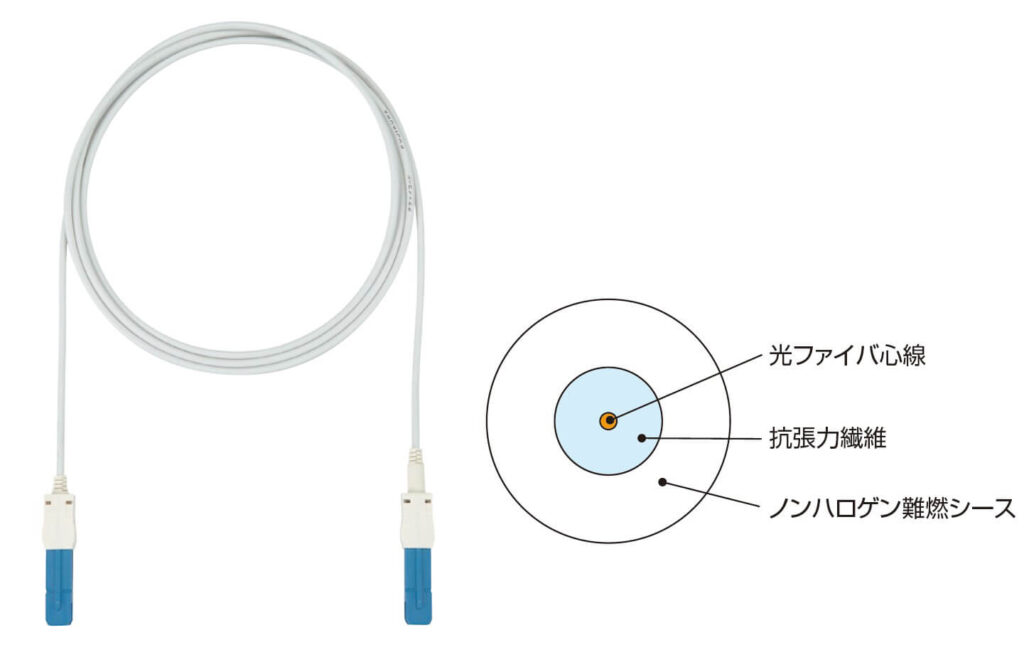 ウルトラフレキシブルケーブルマゲつよ®は、名前の通り、非常に曲げに強い光ファイバケーブルです。宅内などへの布設に最適なケーブルです。シャッタ付きSCコネクタを採用しており、コネクタを外した状態ではシャッタが閉まり、信号光の漏れを防ぎます。光ファイバ心線には、許容曲げ半径がR7.5mmの曲げ特性に優れた光ファイバを採用しています。