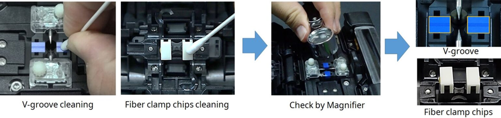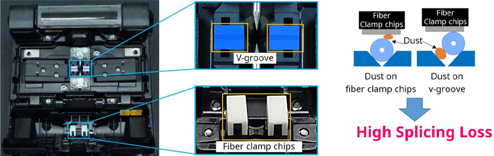 Fujikura recommend to clean v-groove and fiber clamp chips periodically, because dust on v-groove or fiber clamp chips may attach to fiber or influence to motion for splicing fiber, and it may result in high splice loss.