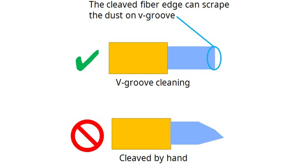 2. If it is difficult to remove the dust on v-groove, cleaved fiber may remove the dust easily.