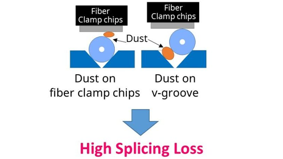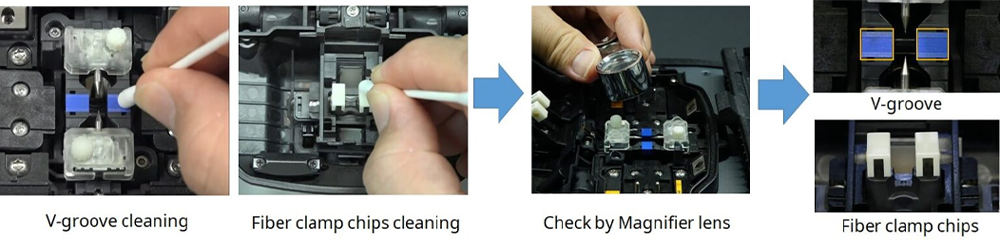 Fujikura recommend to clean v-groove and fiber clamp chips periodically, because dust on v-groove or fiber clamp chips may attach to fiber or influence to motion for splicing fiber, and it may result in high splice loss.