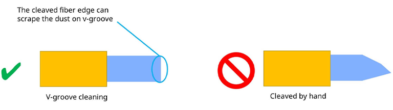 2. If it is difficult to remove the dust on v-groove, cleaved fiber may remove the dust easily.