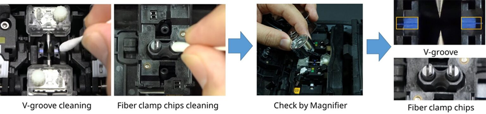 Fujikura recommend to clean v-groove and fiber clamp chip periodically, because dust on v-groove or fiber clamp may attach to fiber or influence to motion for splicing fiber, and it may result in high splice loss.
