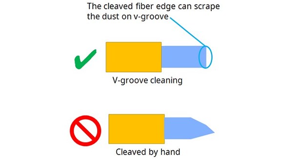 2. If it is difficult to remove the dust on v-groove, cleaved fiber may remove the dust easily.