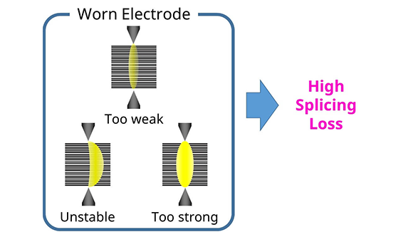 Fujikura recommend to replace the electrode, because worn electrode result in larger splice loss since bad fusing condition.