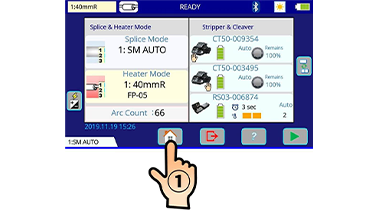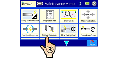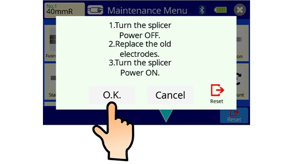 3. The Press the [OK] Icon in menu to turn off the splicer power. When turning off the splicer power, do not press the power switch. If you turn off the splicer power by pressing the power switch, the splicer does not instruct to replace the electrodes.
