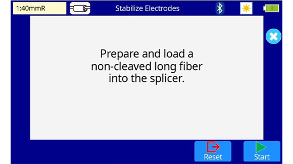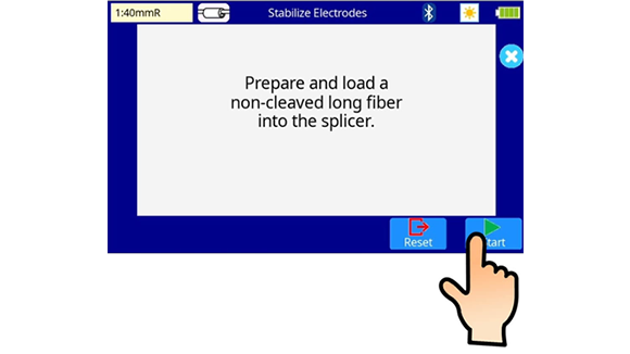 7. Perform Stabilize Electrodes as set the right and left fibers that cleaved into the splicer. Press the start icon on the monitor.