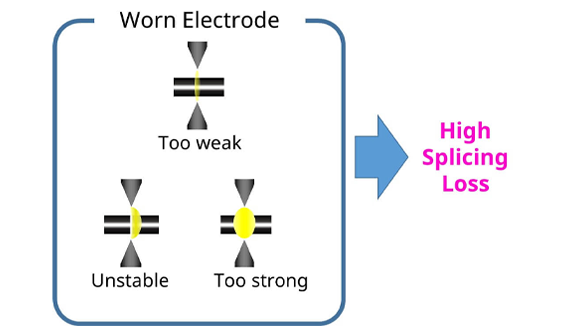 Fujikura recommend to replace the electrode, because worn electrode result in larger splice loss since bad fusing condition.