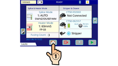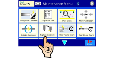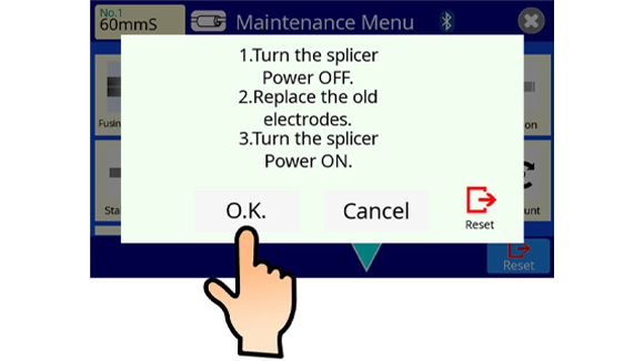 3. The Press the [OK] Icon in menu to turn off the splicer power. When turning off the splicer power, do not press the power switch. If you turn off the splicer power by pressing the power switch, the splicer does not instruct to replace the electrodes.