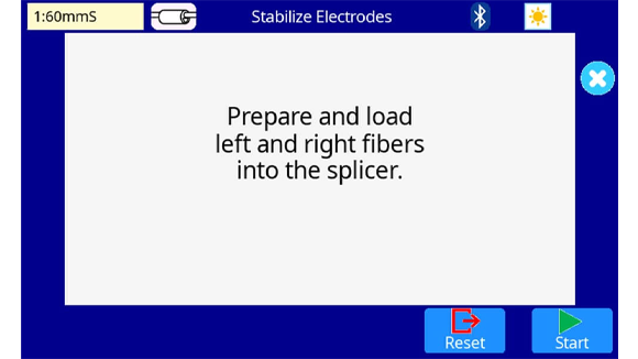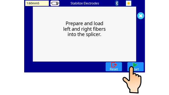 8. Perform Stabilize Electrodes as set the right and left fibers that cleaved into the splicer. Press the start icon on the monitor.