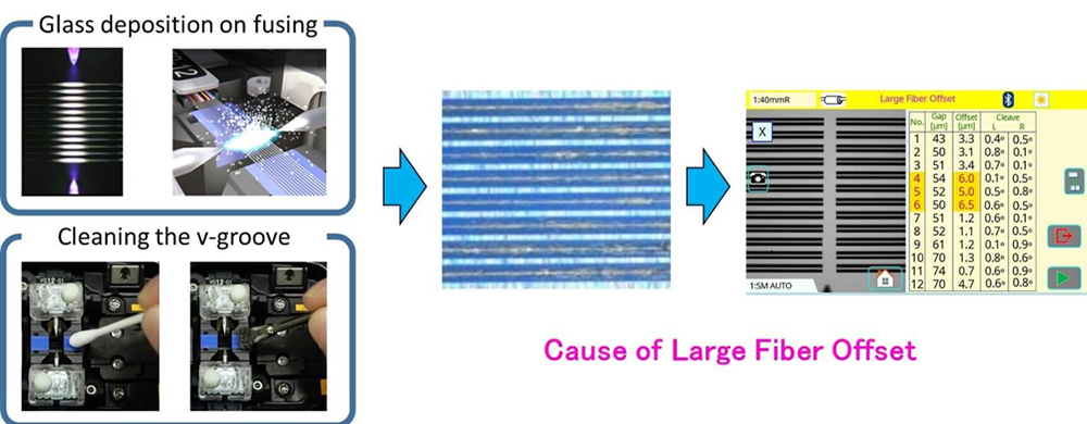 The glass deposition by the discharge during fusion splicing adheres to the V-groove and electrode rod. Although the amount of adhered glass deposited per discharge is very small, the adhered glass may cause misalignment of the fiber axis and affect the splicing loss after long-term use. This adhered glass is difficult to remove by cleaning with a cotton swab or brush.