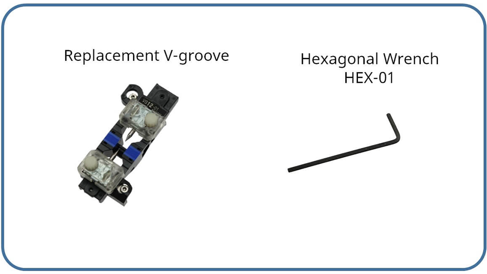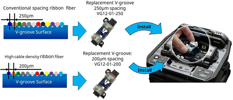The 90R uses a V-groove replacement method, which allows customers to install and remove the V-groove which 200µm spacing V-groove [VG12-01-200] and 250µm spacing V-groove [VG12-01-250].